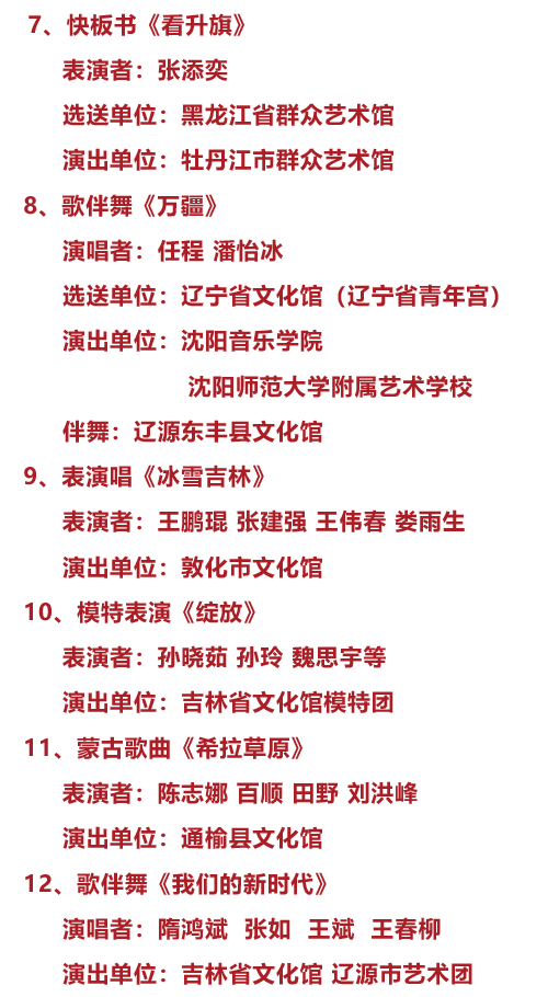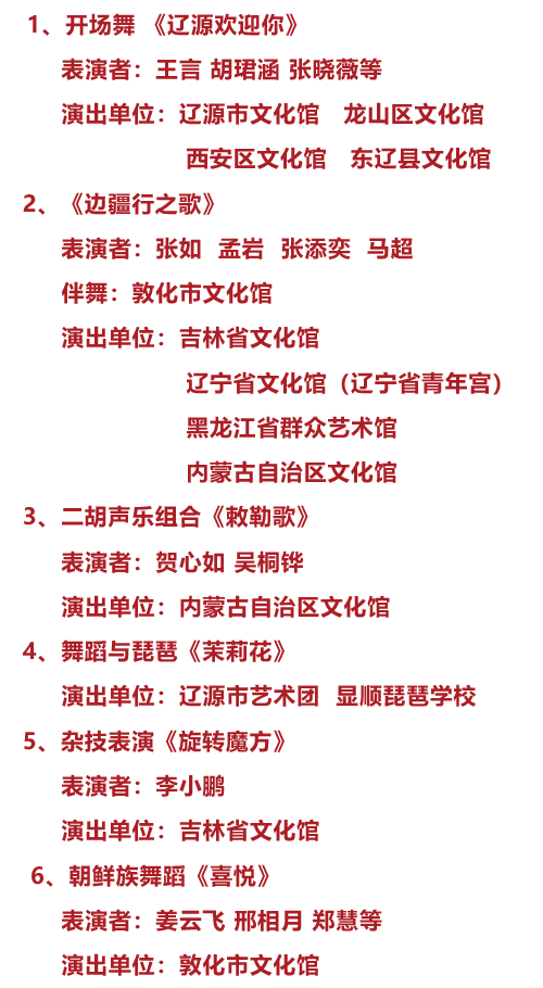 演出单位:辽源市文化馆 龙山区文化馆 西安区文化馆 东辽县文化馆