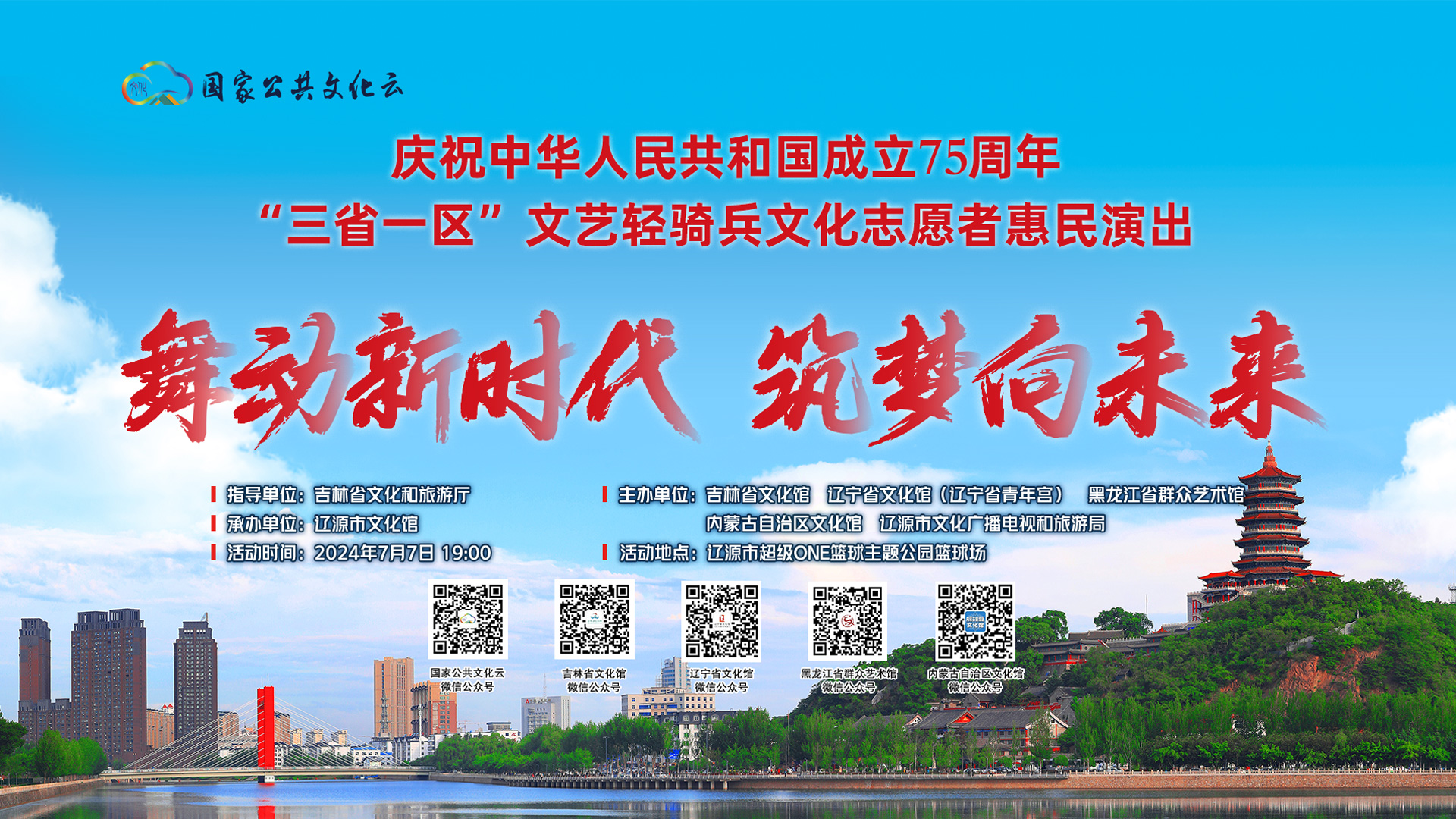 庆祝中华人民共和国成立75周年“ 舞动新时代 筑梦向未来”——“三省一区”文艺轻骑兵文化志愿者惠民演出活动由吉林省文化和旅游厅指导,吉林省文化馆、辽宁省文化馆(辽宁省青年宫)、黑龙江省群众艺术馆、内蒙古自治区文化馆、辽源市文化广播电视和旅游局主办,辽源市文化馆承办。7月7日19:00,活动将在辽源市超级ONE篮球主题公园篮球场精彩开启!...
